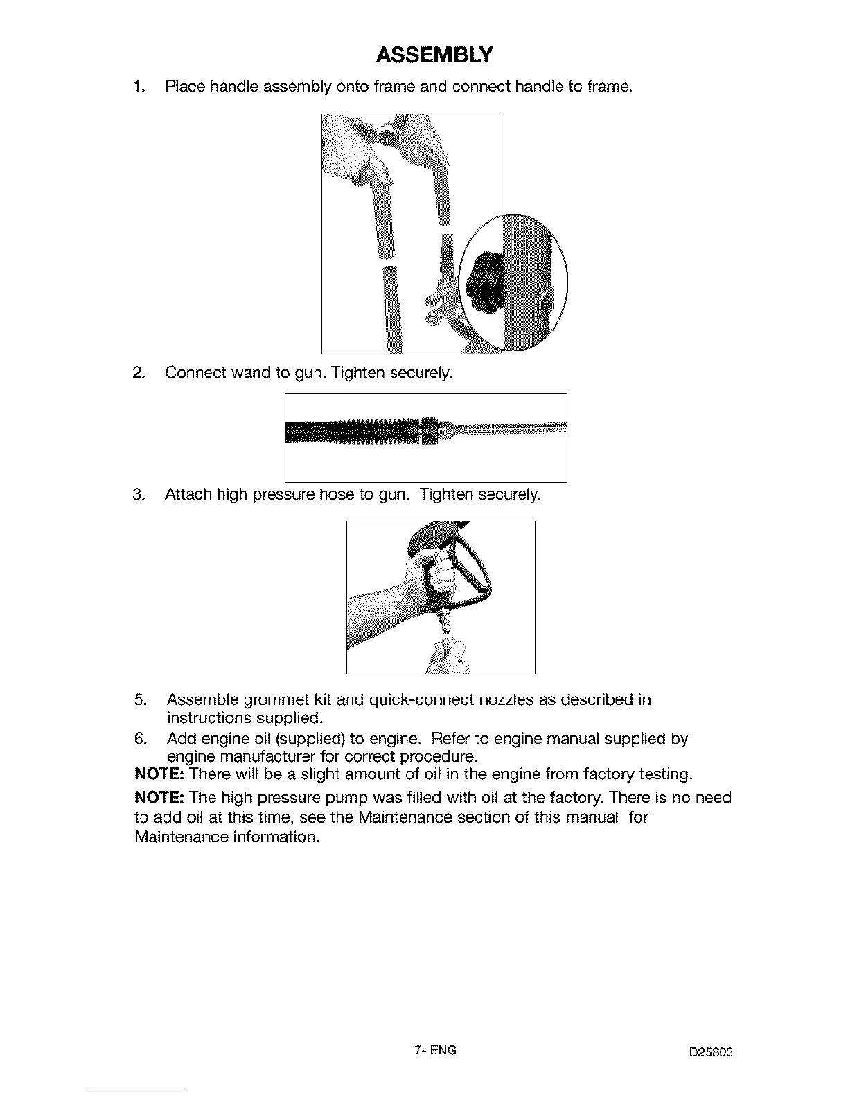 6. Add engine oil (supplied) to engine. Refer to engine manual supplied by