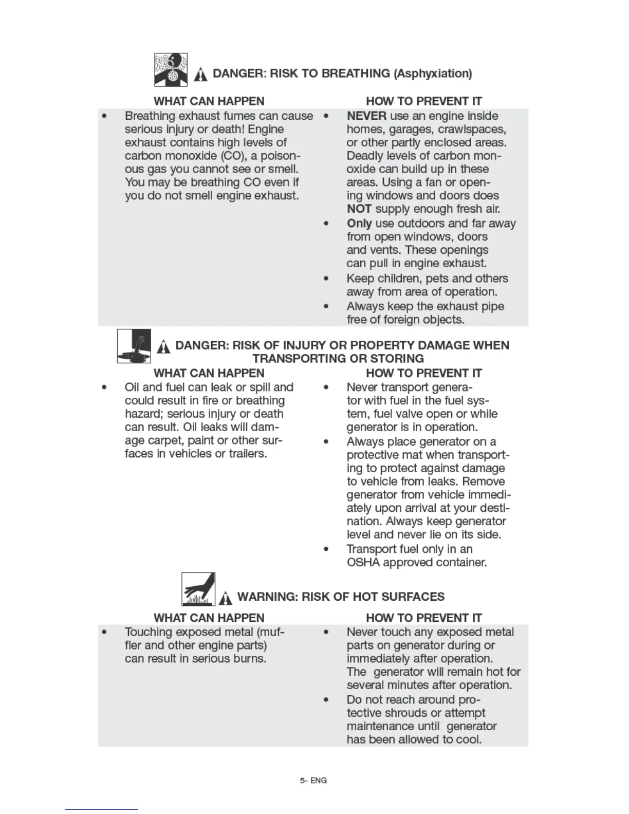 Porter-Cable PCI2200 - Risk to Breathing (Asphyxiation); Carbon Monoxide Hazard; Outdoor Operation and Ventilation; Risk of Injury or Property Damage (Transport;Storage)