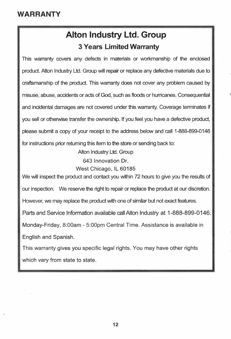 Parts and Service Information available call Alton Industry