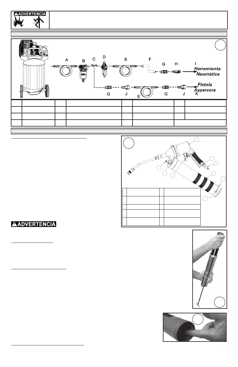 A Manguera de aire D Engrasador en línea G Acoplador rápido J Conector hembra