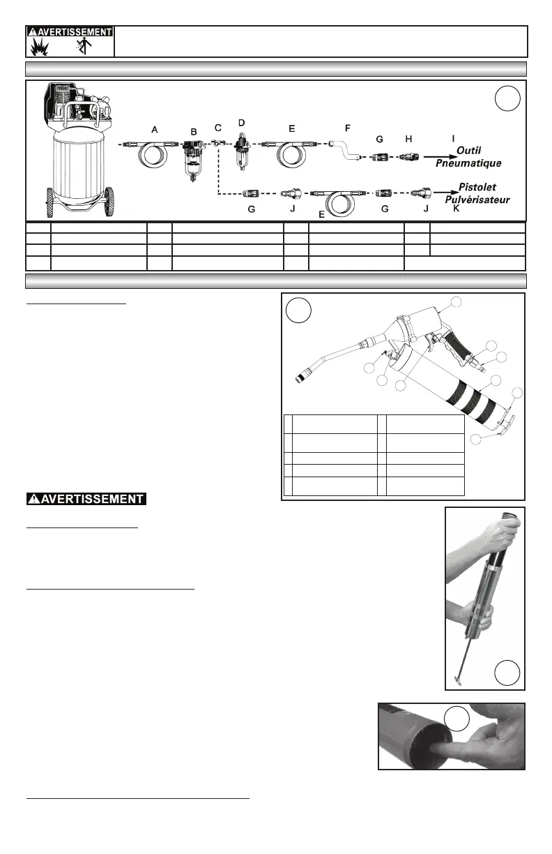 A Tuyau flexible d’air D Huilier sur canalisation G Raccord rapide J Raccord femelle