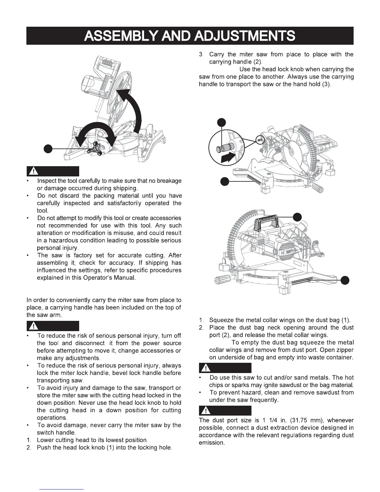 Porter-Cable PXMS12ISB - ASSEMBLY AND ADJUSTMENTS (Cont.); Transporting and Dust Bag Installation