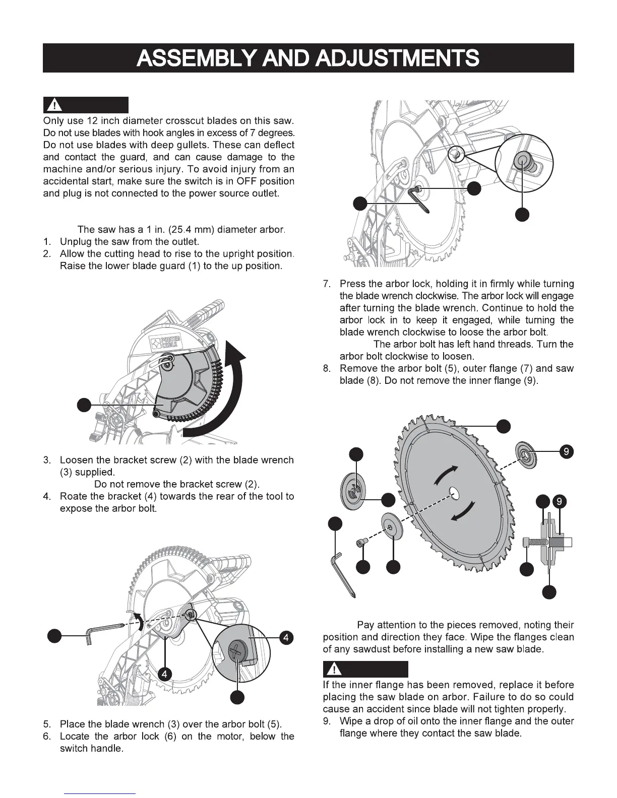 Porter-Cable PXMS12ISB - ASSEMBLY AND ADJUSTMENTS (Cont.); Blade Removal, Installation, and Safety