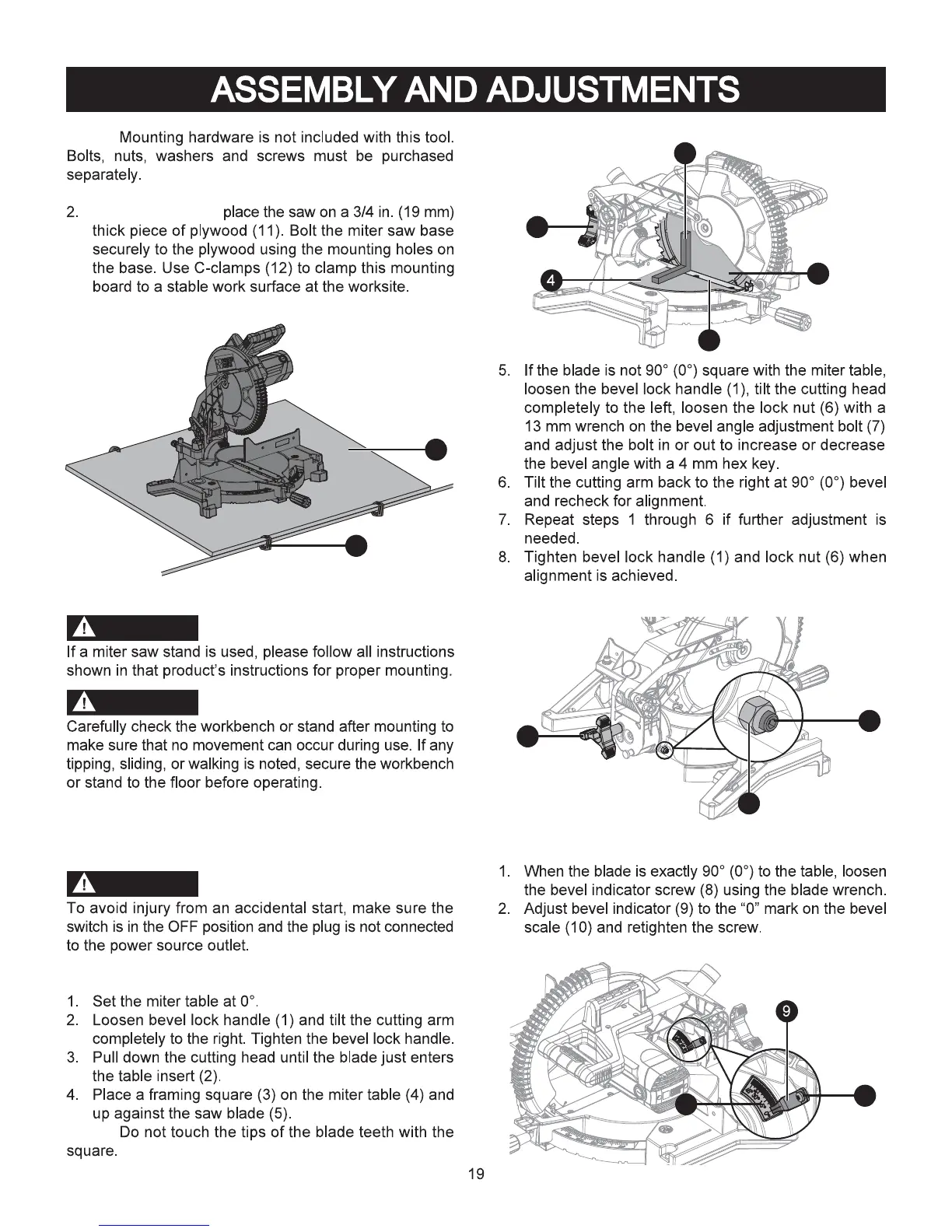 Porter-Cable PXMS12ISB - ASSEMBLY AND ADJUSTMENTS (Cont.); Bevel Adjustment and Pointer Calibration