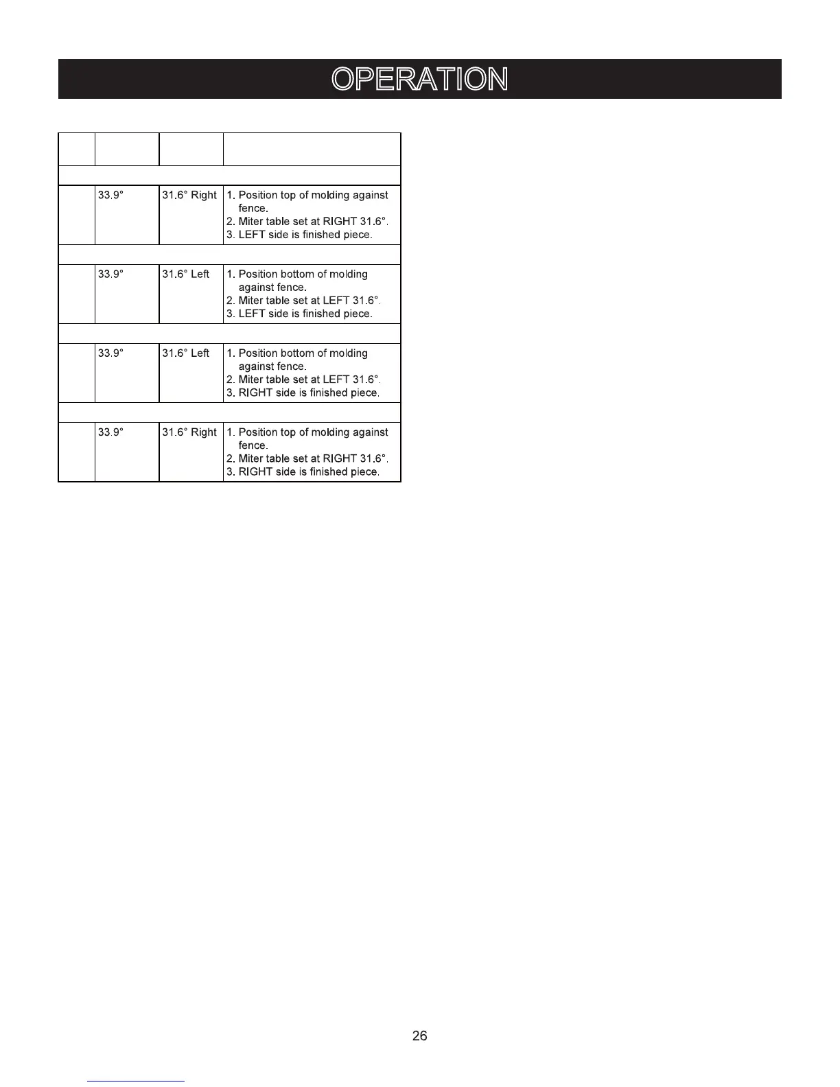 Porter-Cable PXMS12ISB - OPERATION (Cont.); Molding Angle Settings