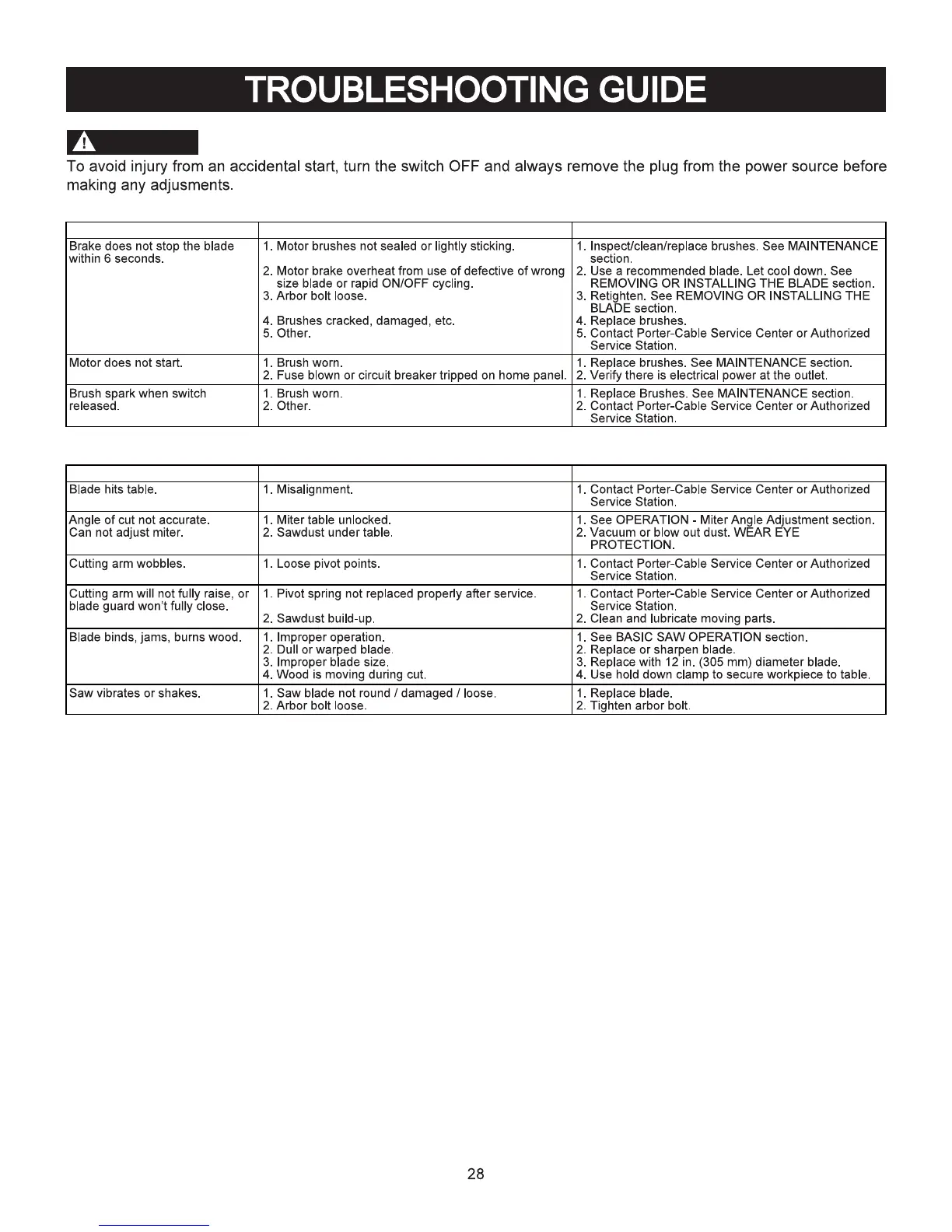 Porter-Cable PXMS12ISB - TROUBLESHOOTING GUIDE; Motor and Saw Operation Issues