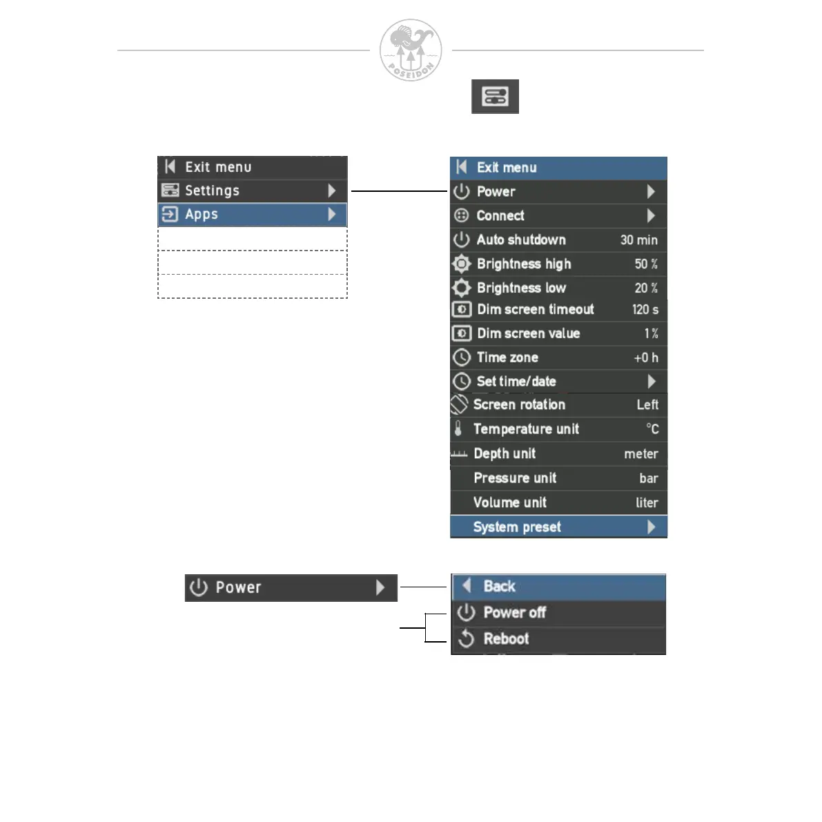 The power menu allows you to turn off the M28 or reboot the M28. If the unit