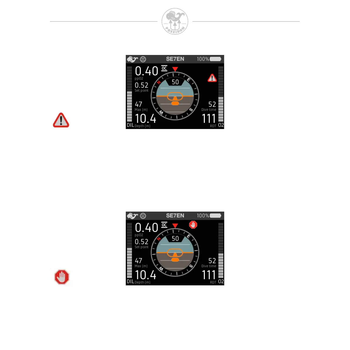 The Stop alert symbol located in the Alarm Signal Area, is displayed if the diver