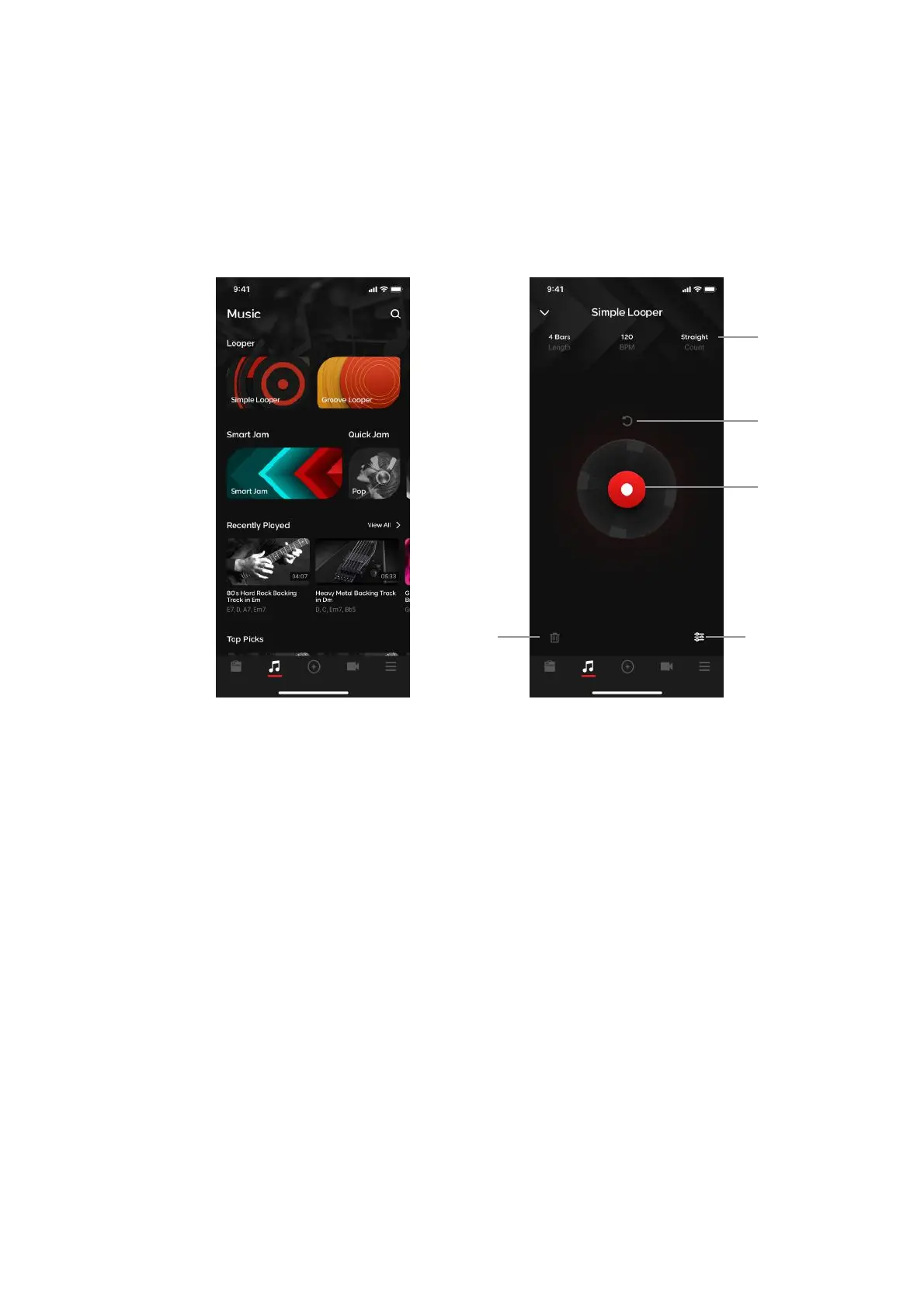(A) Looper Settings - tap on this area to access looper settings to adjust parameters.