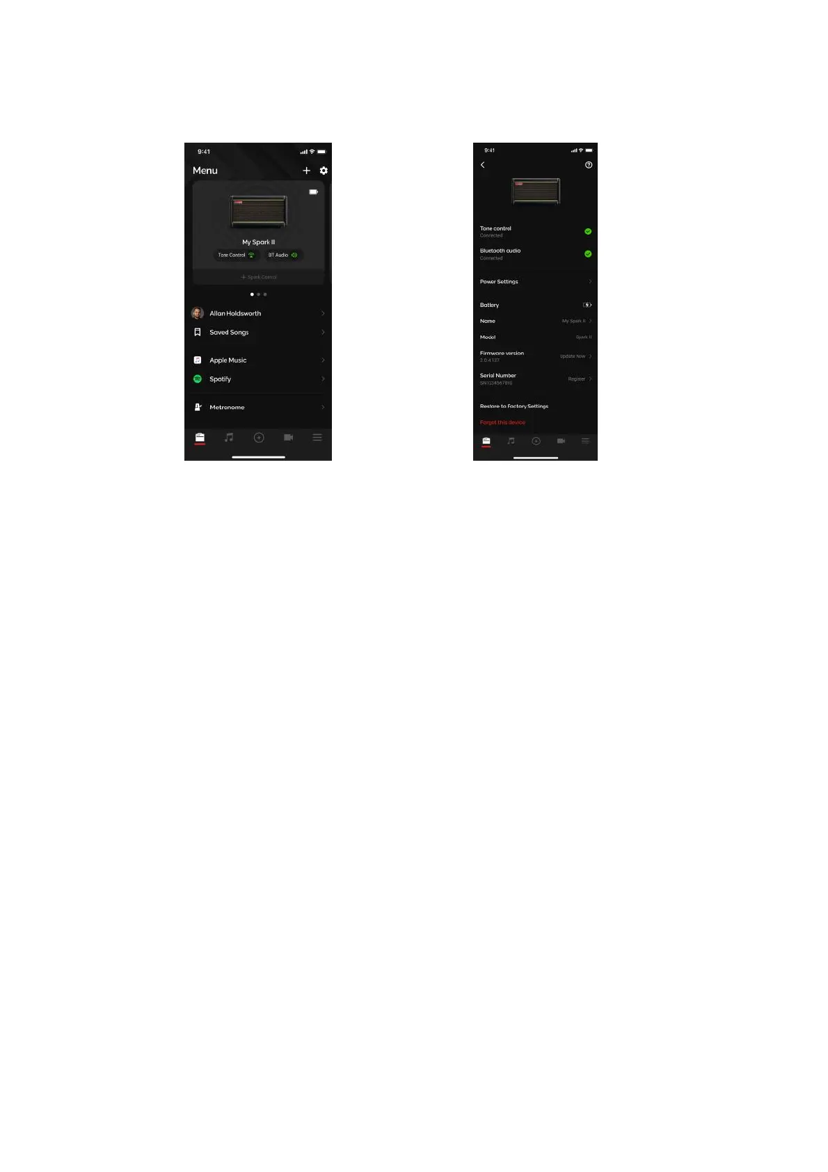 7. Serial Number - Displays the Serial Number of your Spark amp.