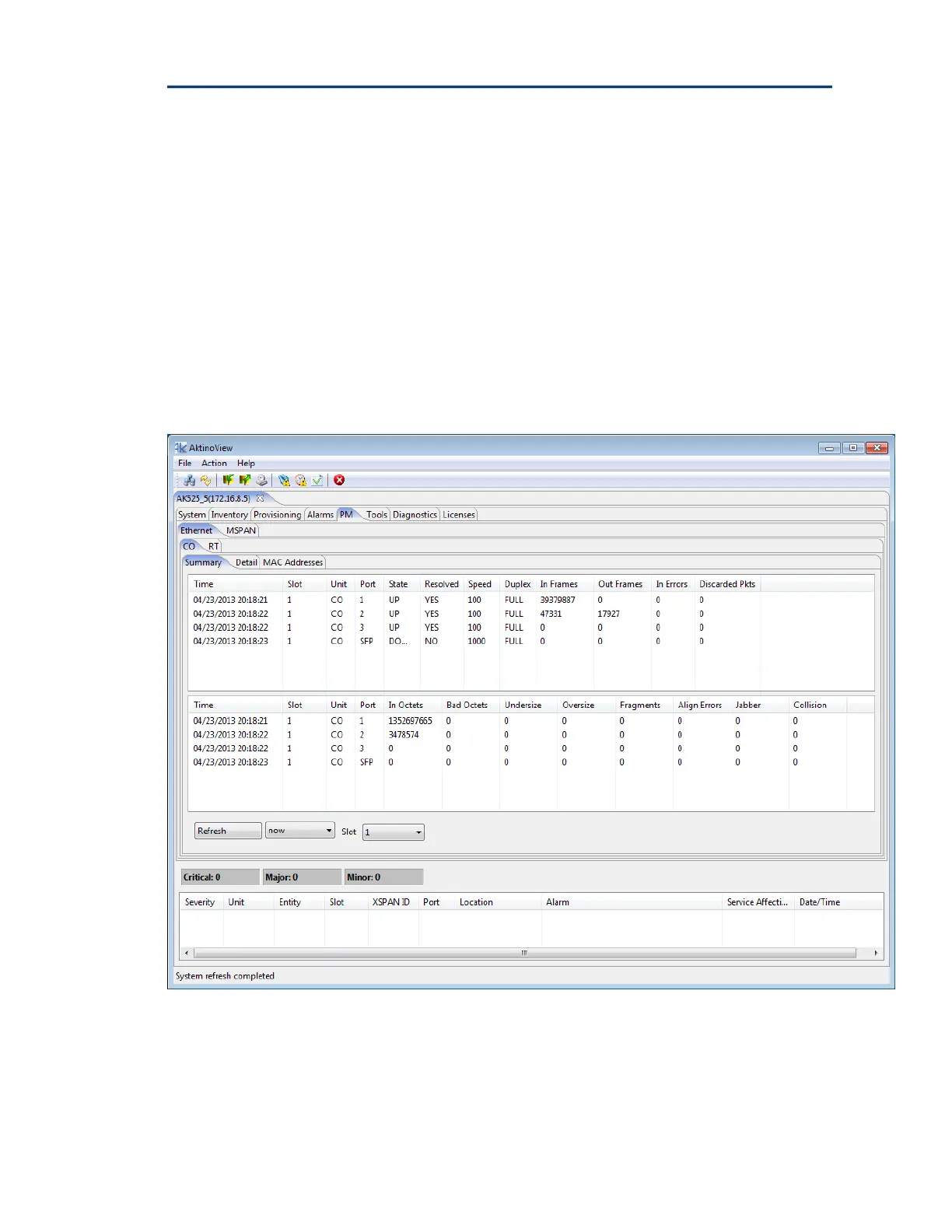 for the selected Ethernet Slot. The page can be provisioned to refresh