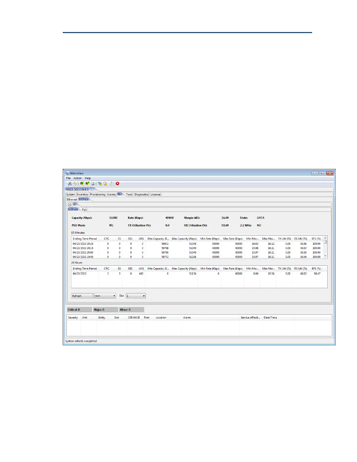including upstream MSPAN Capacity, Rate, and SNR Margin values.