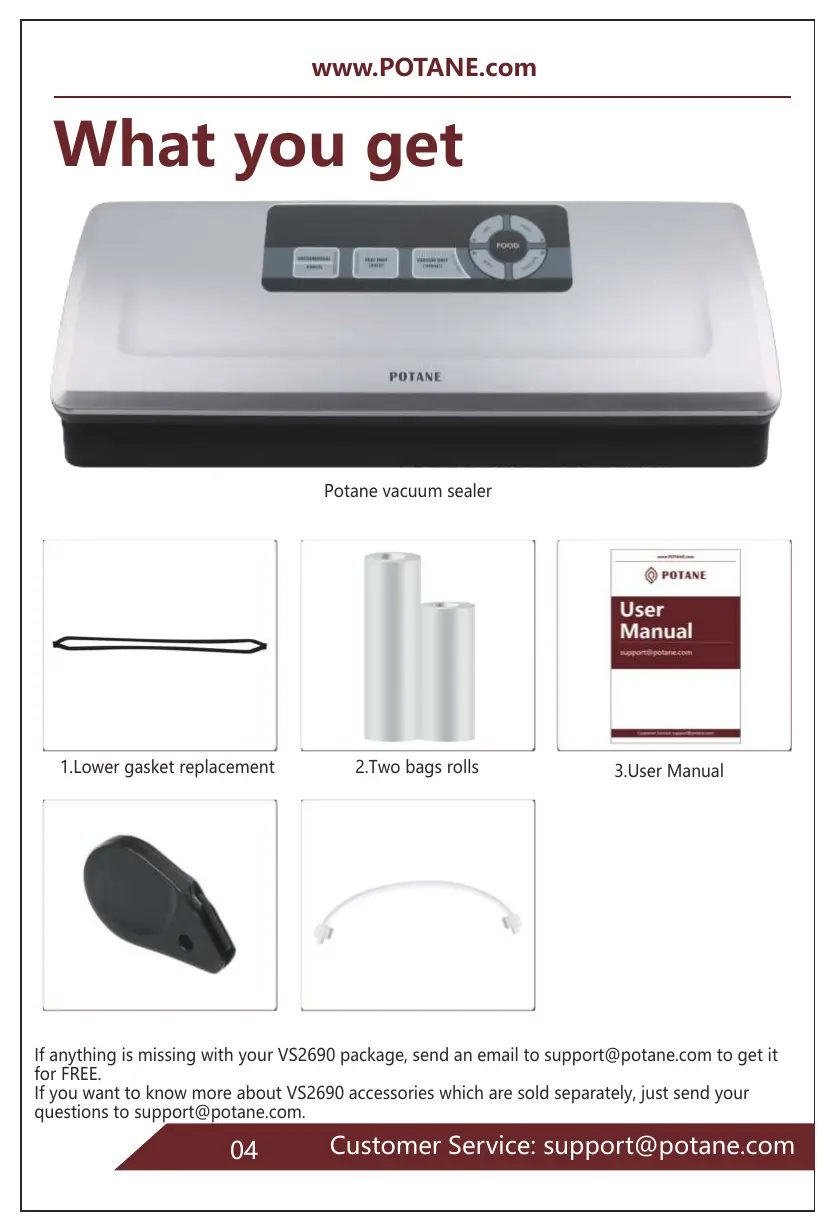 If anything is missing with your VS2690 package, send an email to support@potane.com to get it
