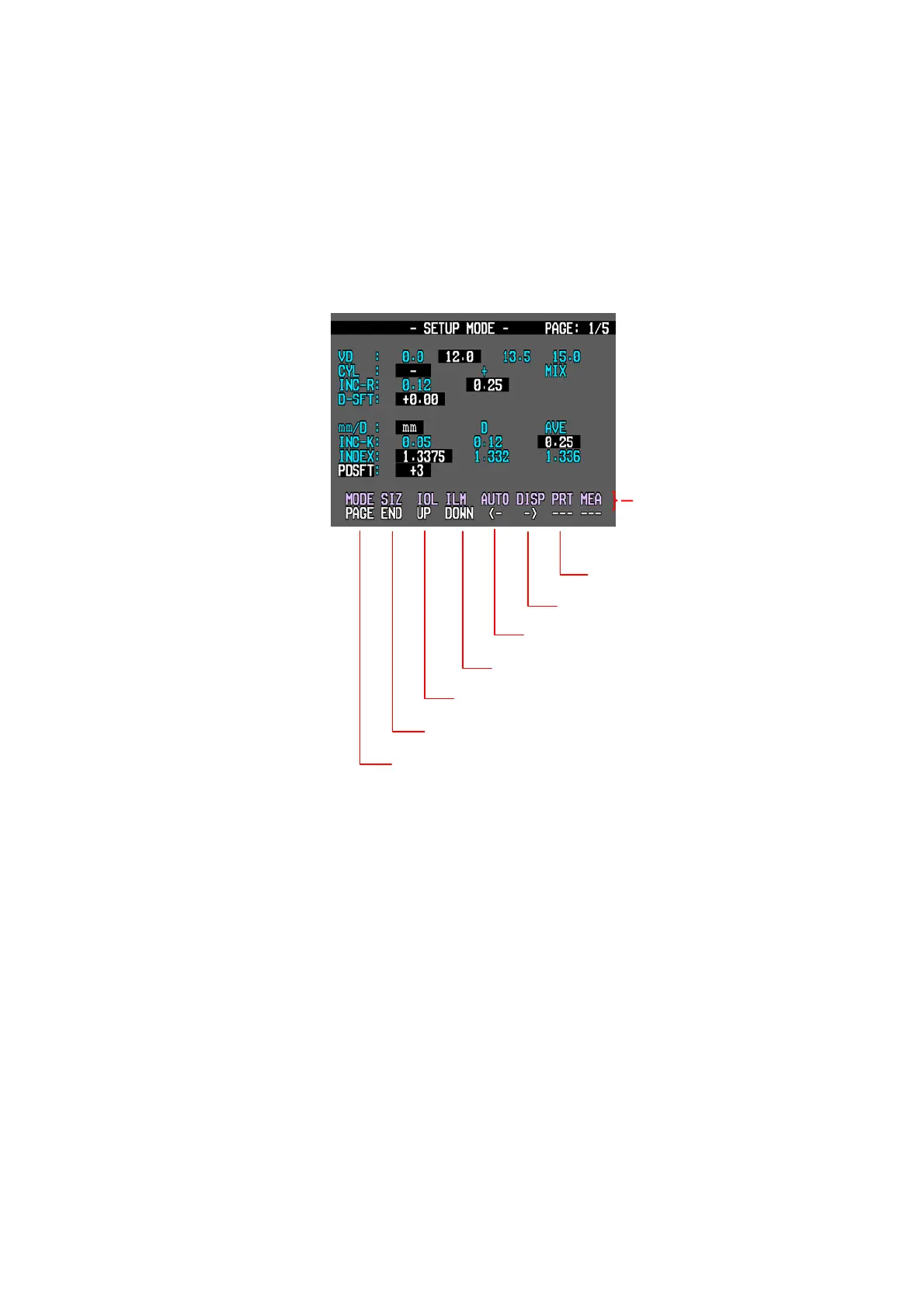 Press DISPLAY and IOL button in Measurement Mode. Page 1/5 of SETUP Mode will be