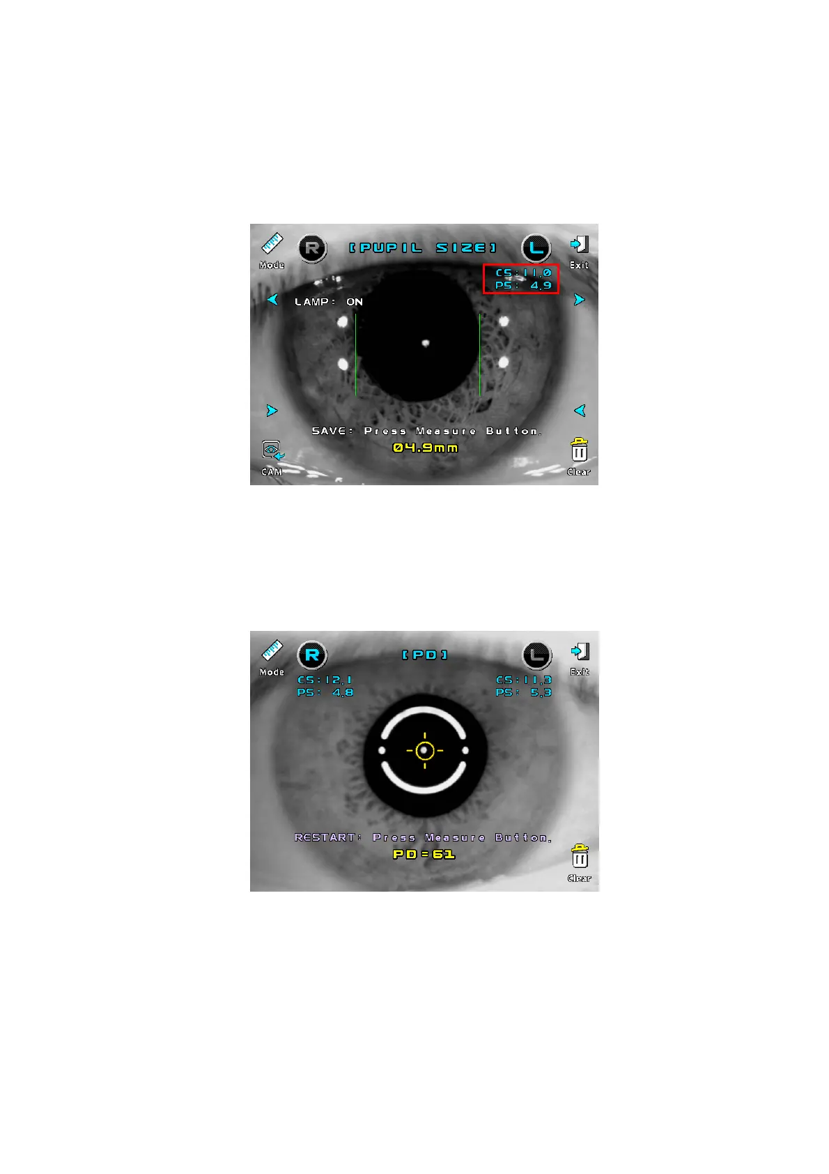Press the Mode button to select Pupil Size mode.