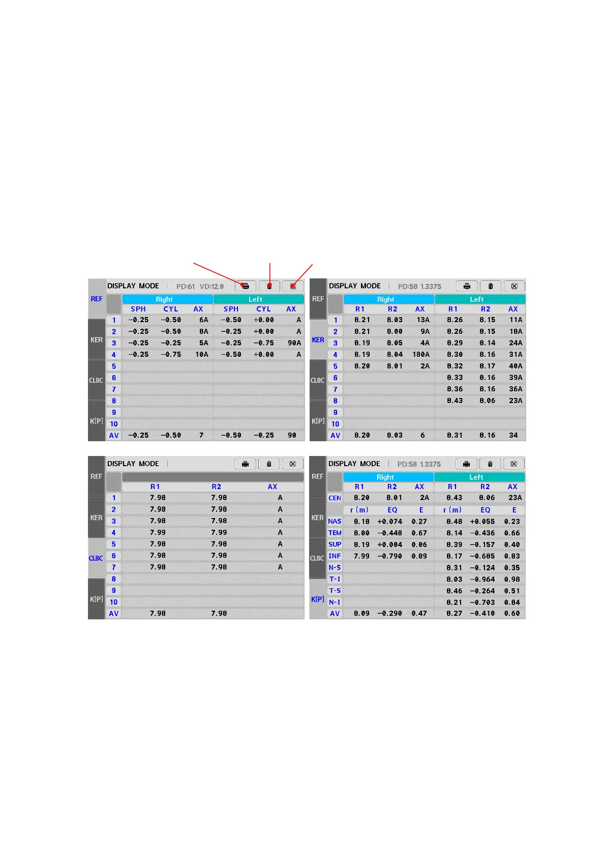 The stored data (maximum 10 data for each eye) in memory can be displayed in this mode.
