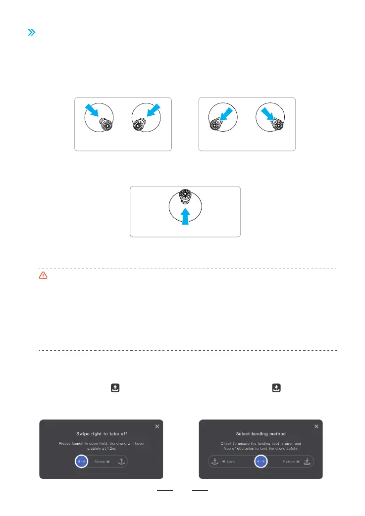 Push the throttle control stick upwards gently as shown in the picture, release the control stick when the drone