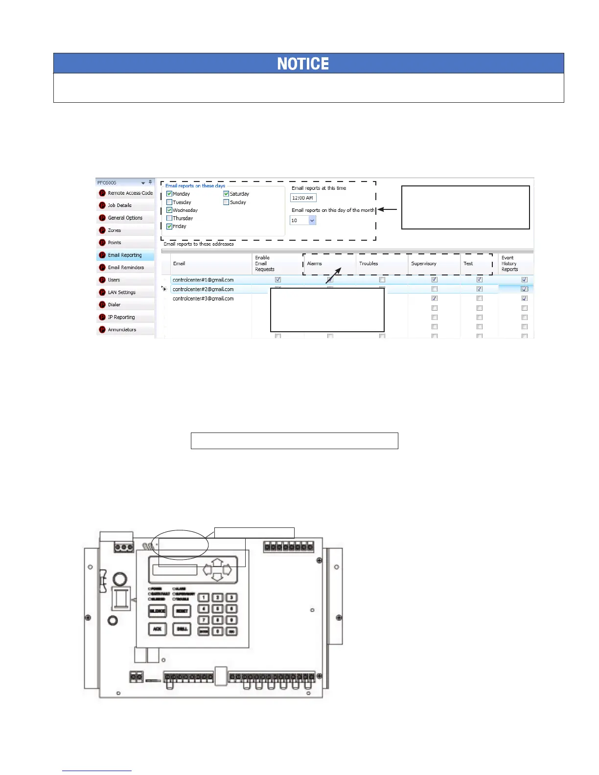 remotely from a PC, if the user has a valid e-mail address programmed on the "E-mail Reporting" window.