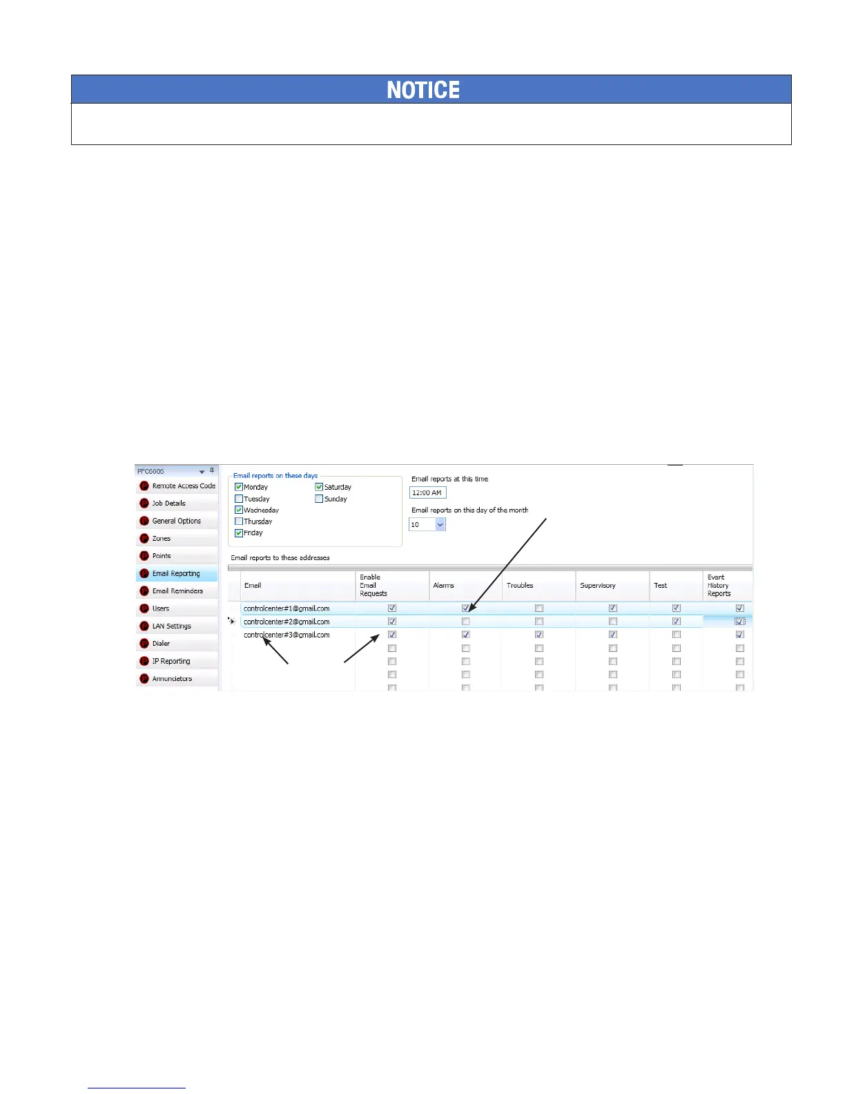 • The person sending the e-mail must be added to the e-mail list in the “E-mail Reporting” section of the software as