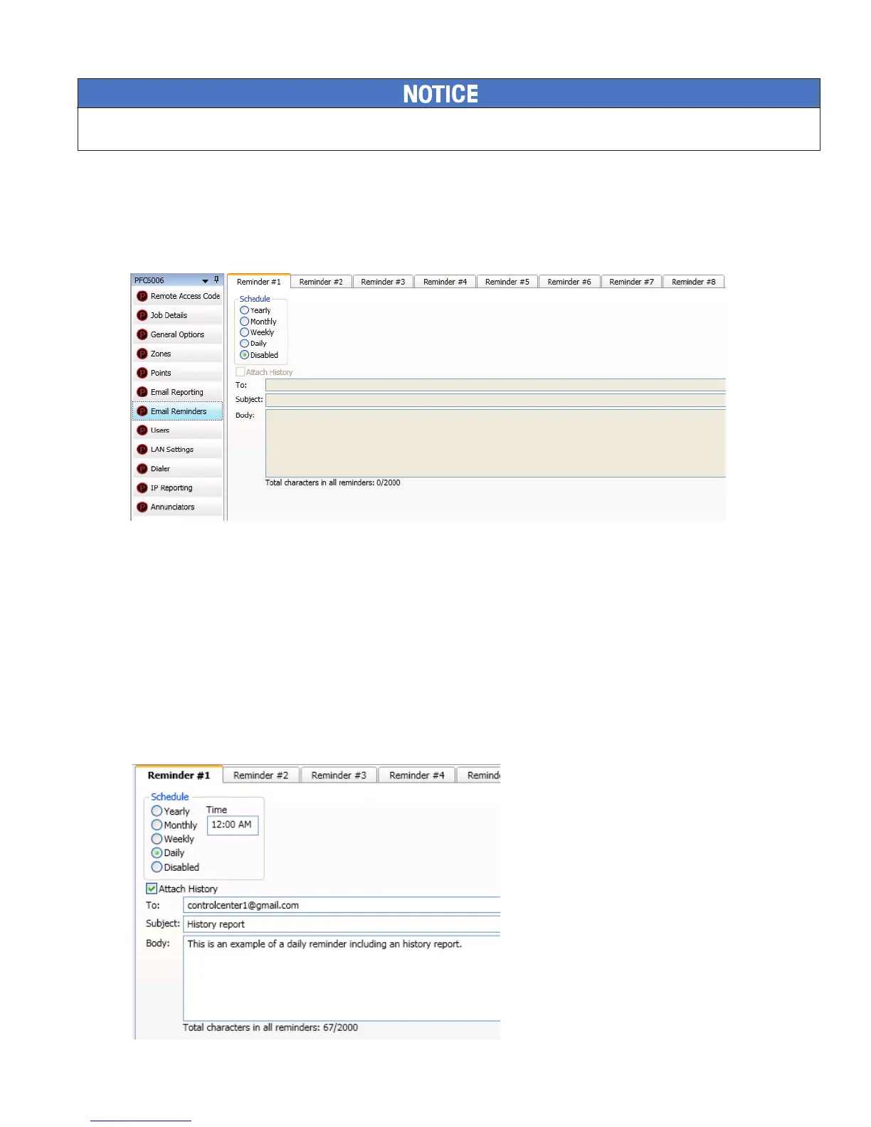 and body are dened by the installer, and they may choose to attach the History reports. Up to eight separate e-mail reminders
