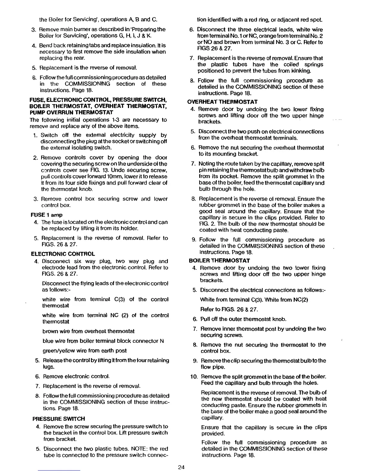 Potterton Prima 80F - Component Replacement - Controls; Fuse, Electronic Control, Pressure Switch Replacement; Thermostat Replacement Procedures