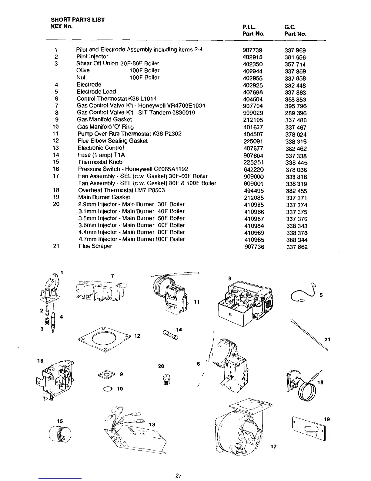 Potterton Prima 80F - Short Parts List; Pilot, Electrode, and Gas Components; Control and Fan Components