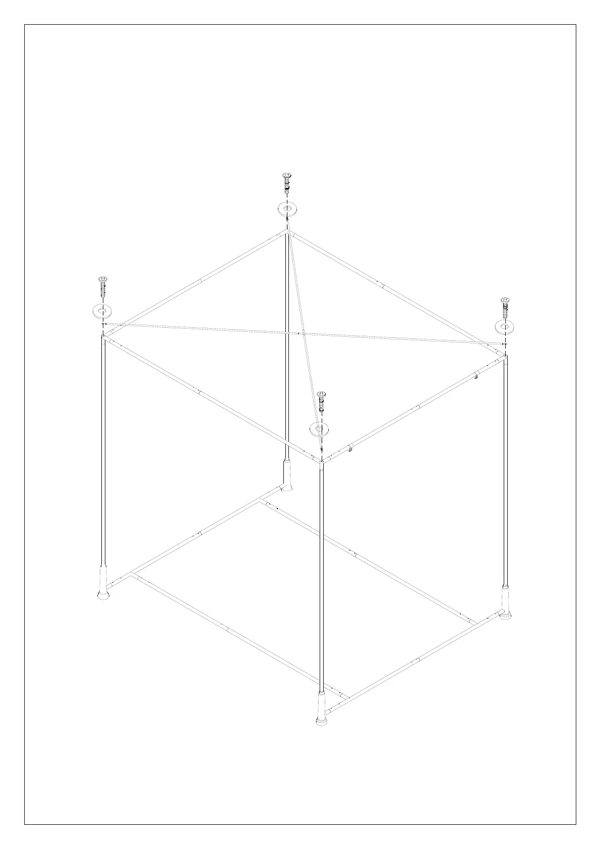 9. Attach the Canopy to the top corner with 4 persons as shown, insert Long Bolt (c) thru Flat Washer (d) and