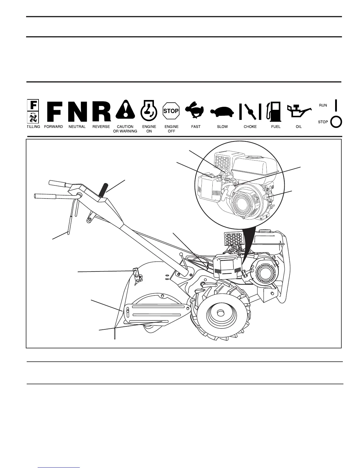 Compare the illustrations with your tiller to familiarize yourself with the location of various controls and adjustments. Save
