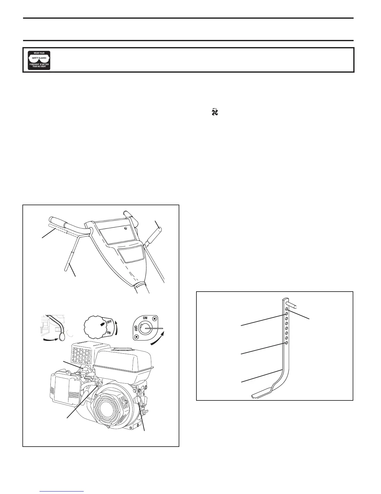 severe eye damage. Always wear safety glasses or eye shields before starting your tiller and while