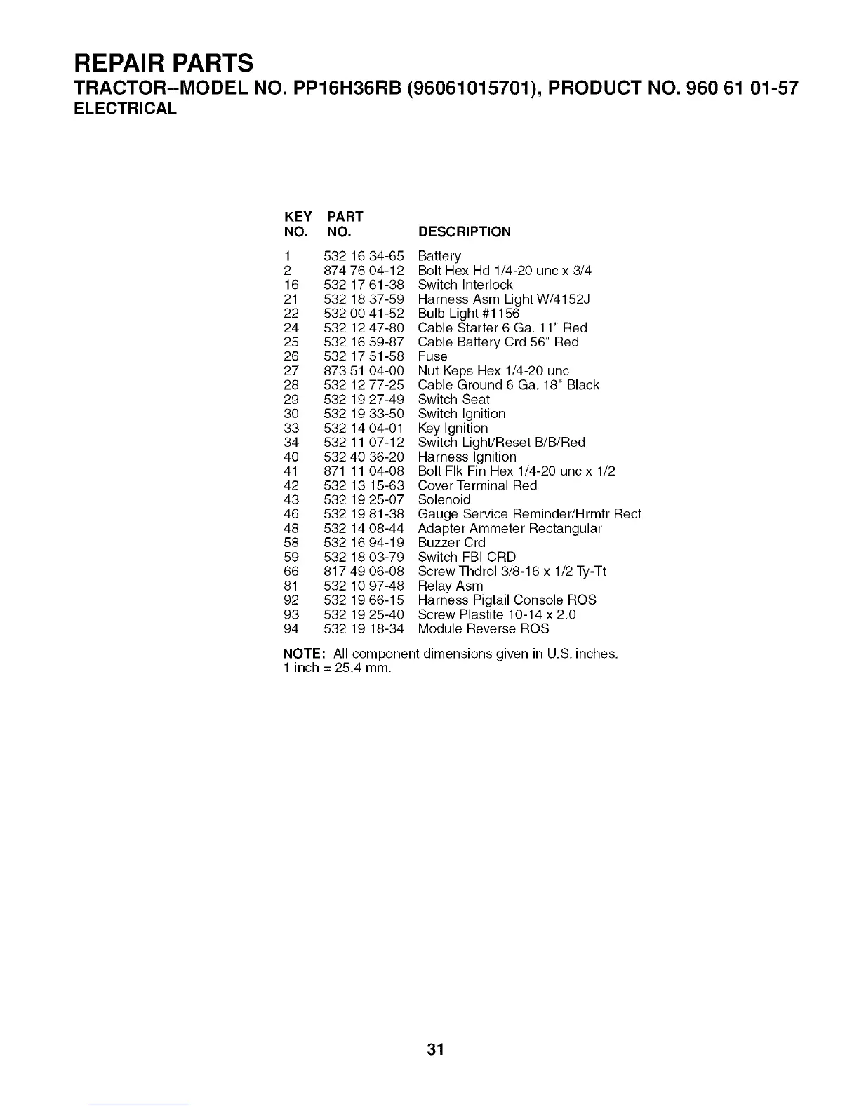 TRACTOR--MODEL NO. PP16H36RB (96061015701), PRODUCT NO. 960 61 01-57