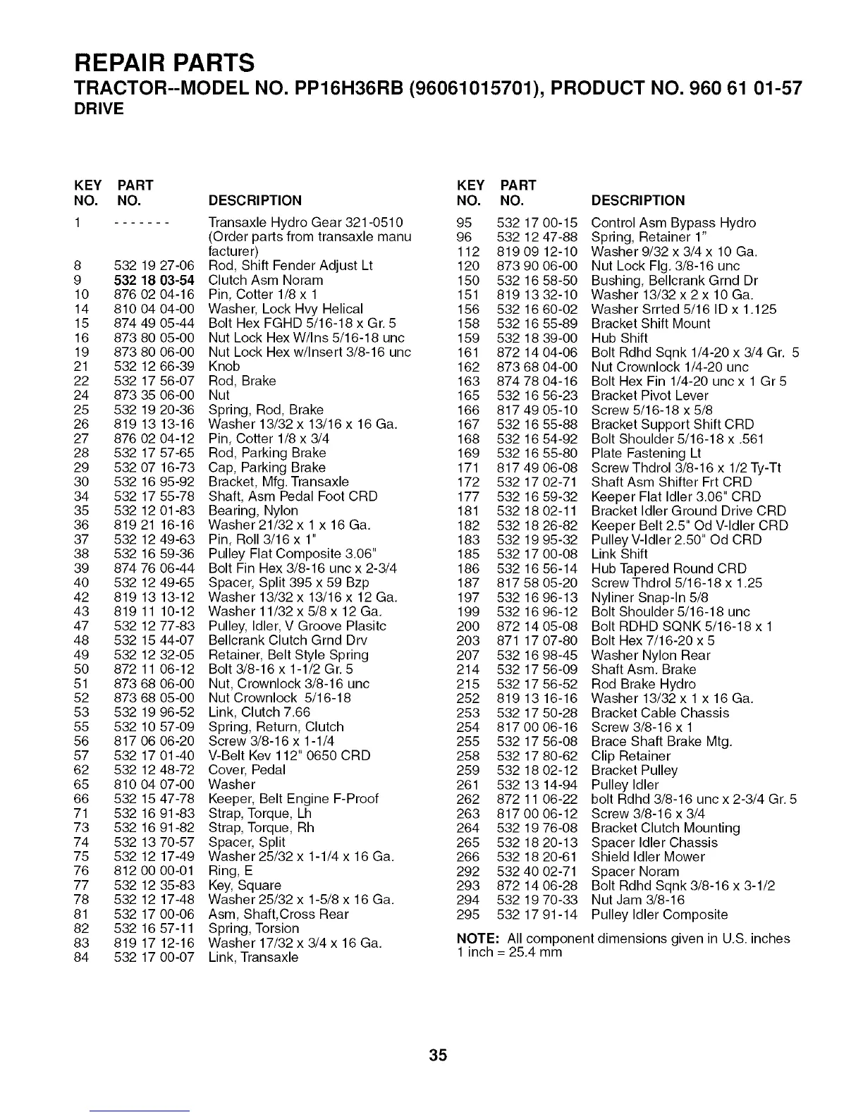 TRACTOR--MODEL NO. PP16H36RB (96061015701), PRODUCT NO. 960 61 01-57