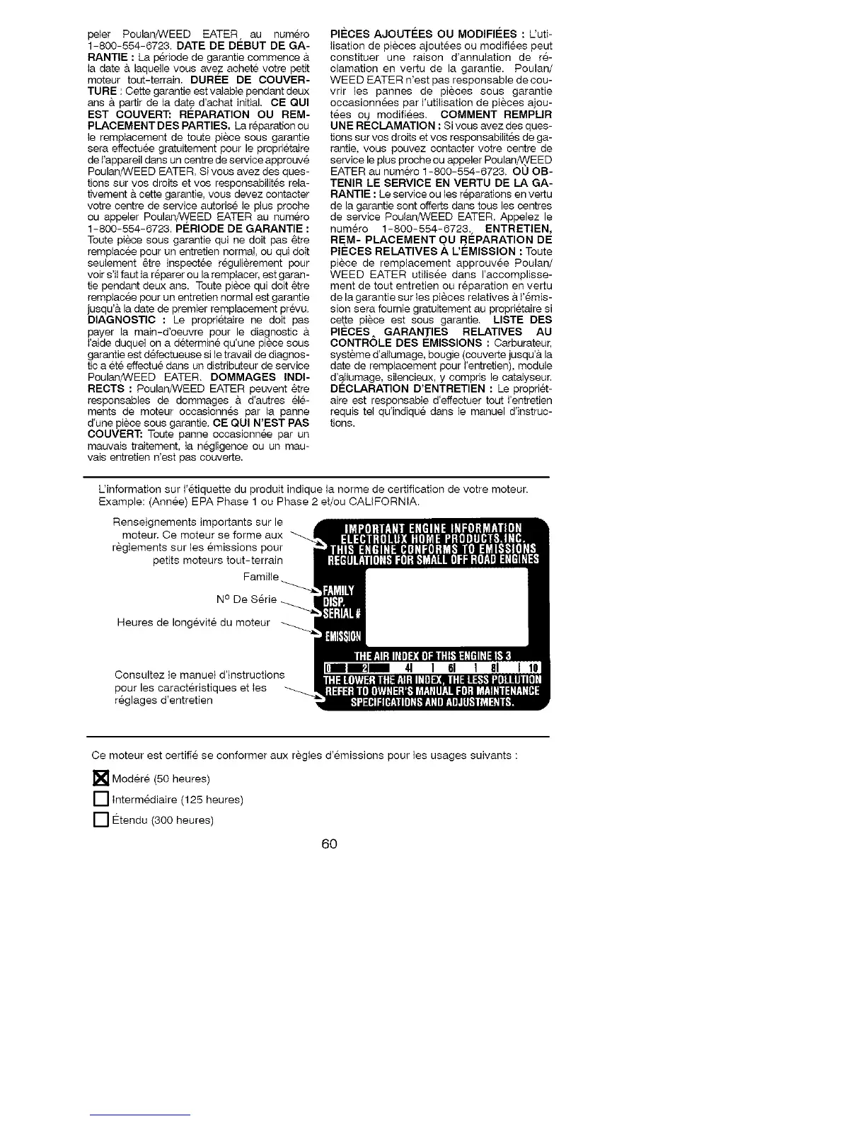Uinformation sur I'etiquette du produit indique la norme de certification de votre moteur.