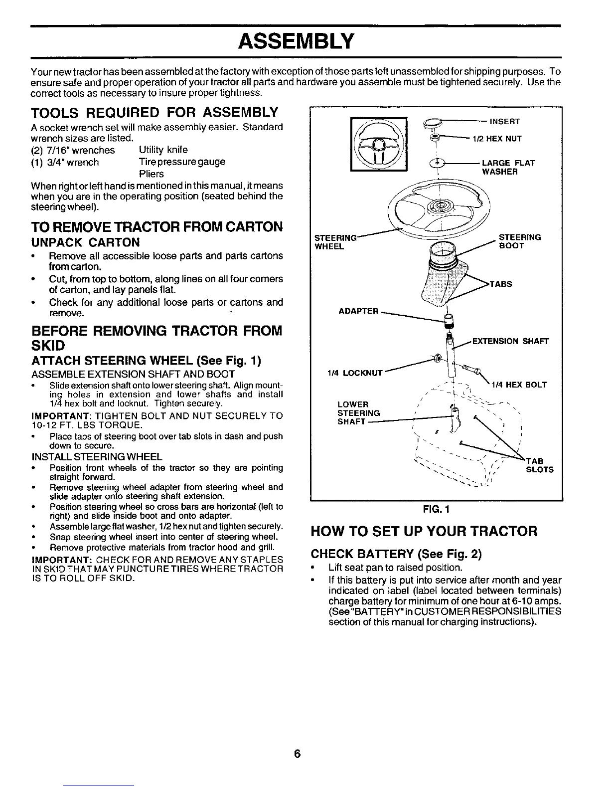 ensure safe and proper operation of your tractor all parts and hardware you assemble must be tightened securely. Use the