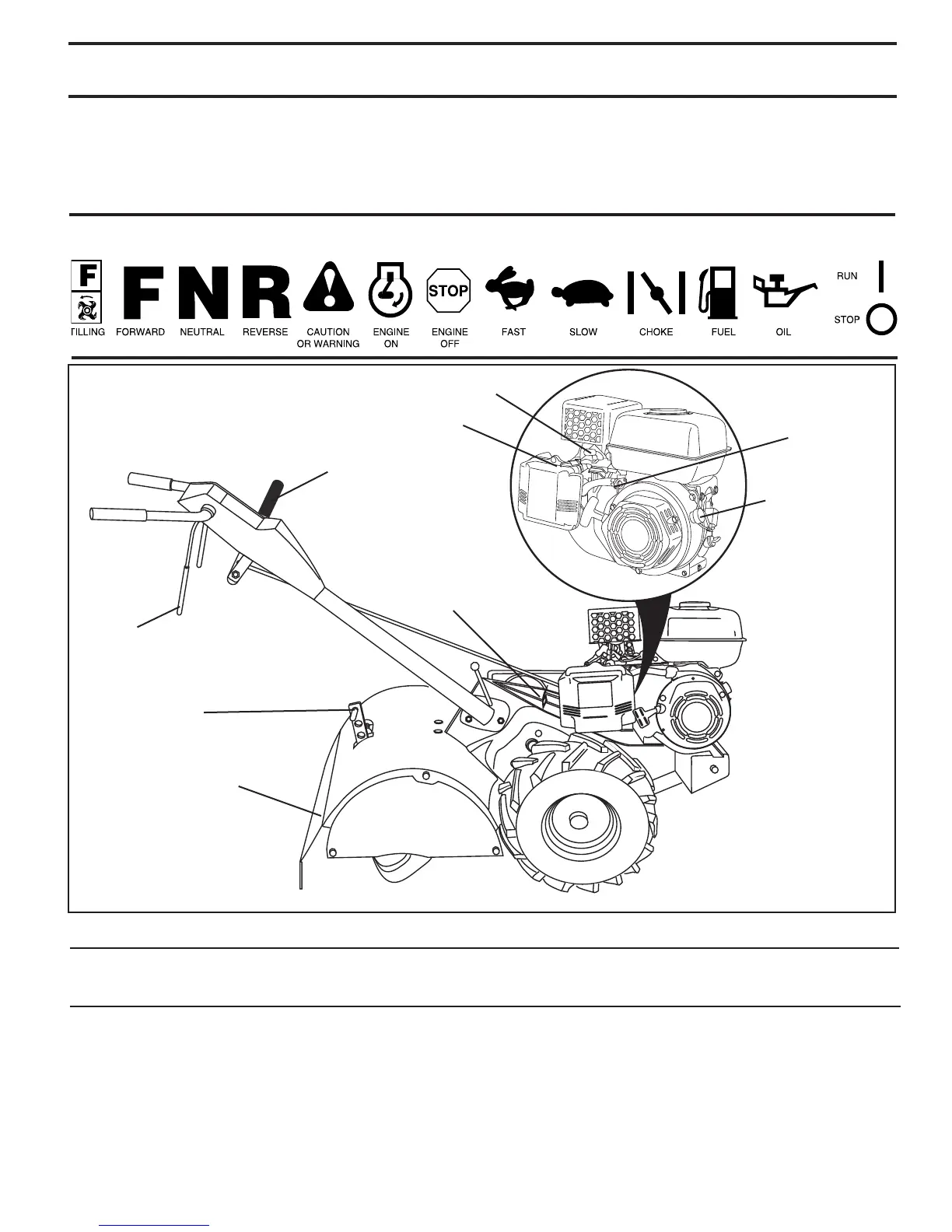 Compare the illustrations with your tiller to familiarize yourself with the location of various controls and adjustments. Save