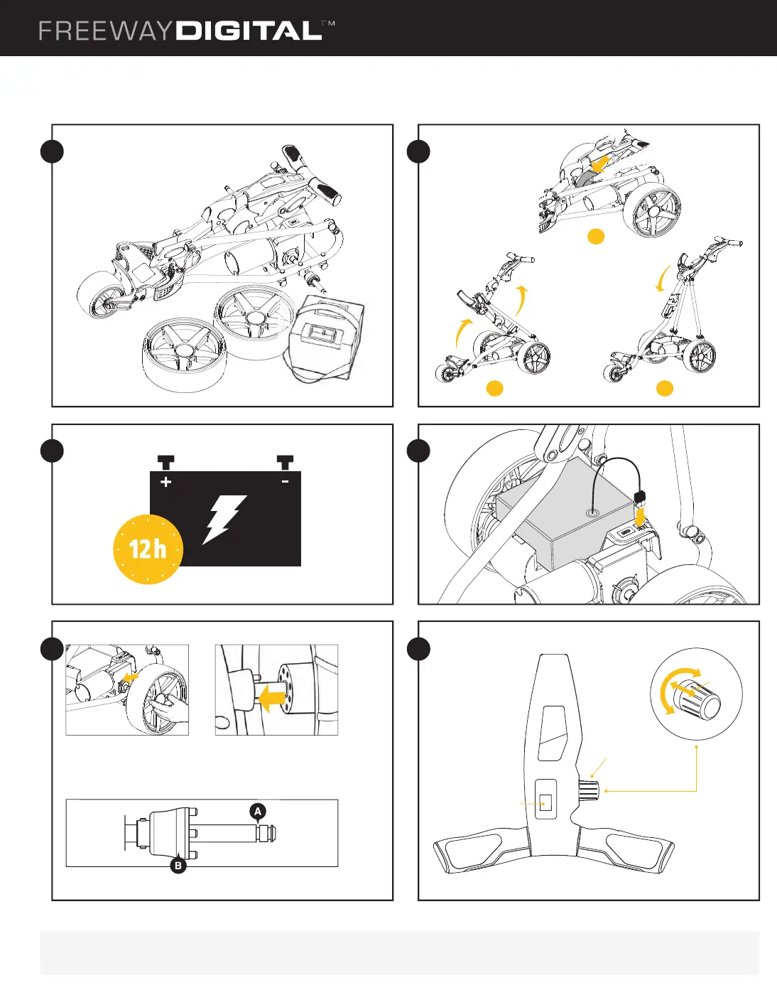 Powakaddy FREEWAY DIGITAL - Initial Setup and Component Overview; Wheel Positioning Guide; Handle and Control Functions