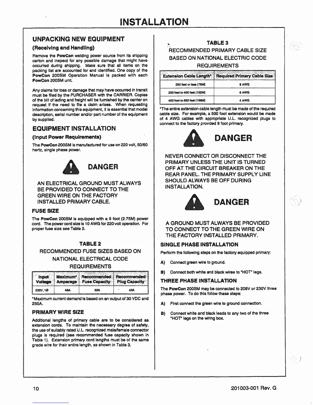 PowCon 200SM - INSTALLATION; NEW EQUIPMENT UNPACKING AND INSPECTION; EQUIPMENT INSTALLATION REQUIREMENTS; FUSE AND WIRE SIZE SELECTION