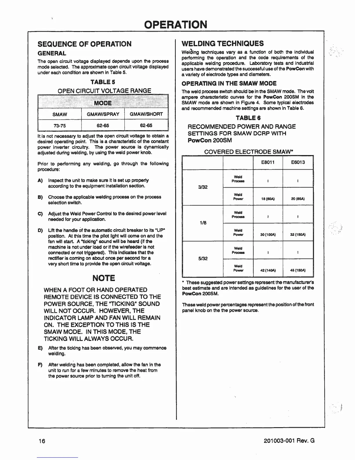 PowCon 200SM - SEQUENCE OF OPERATION; WELDING TECHNIQUES GUIDELINES; SMAW MODE OPERATION