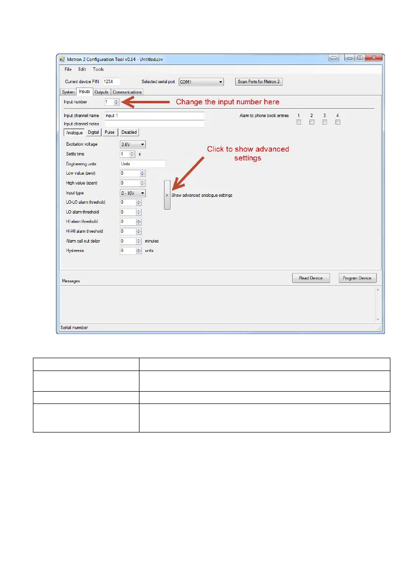 The inputs tab allows each input to be configured as an analogue or digital input. Channels 5 – 9 can only be