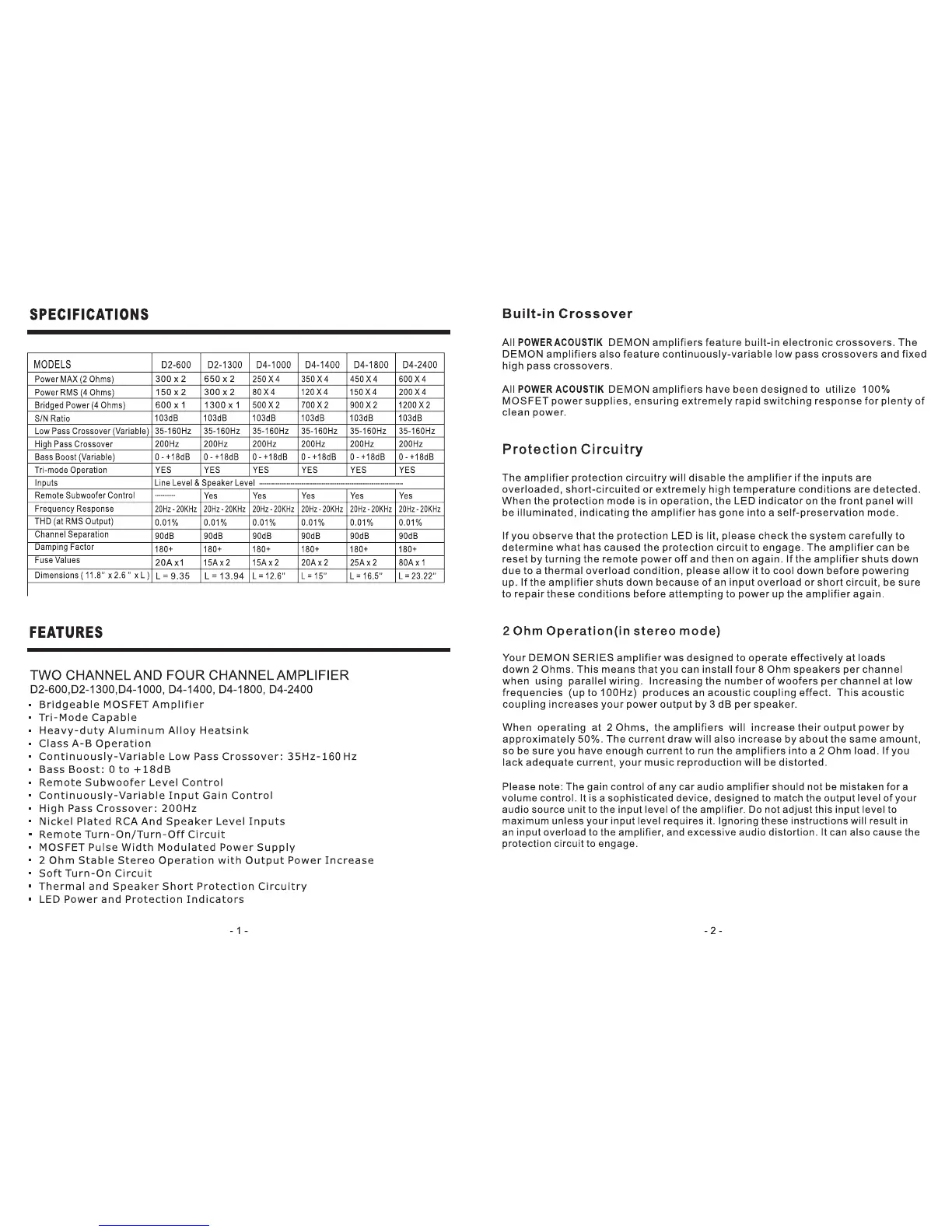 Power Acoustik D2-600 - Features; Specifications; Protection Circuitry; 2 Ohm Operation (in Stereo Mode)
