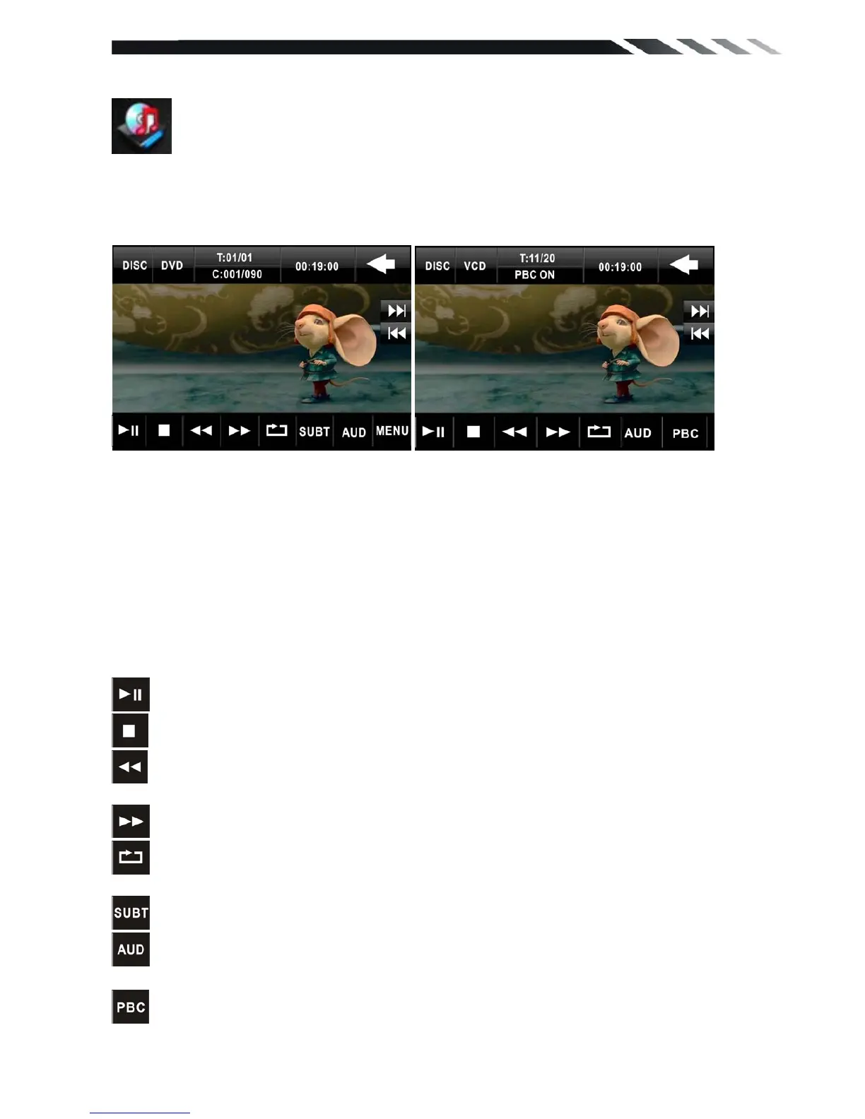 function);In VCD mode touch it can choose MONO L---MONO R---STEREO.