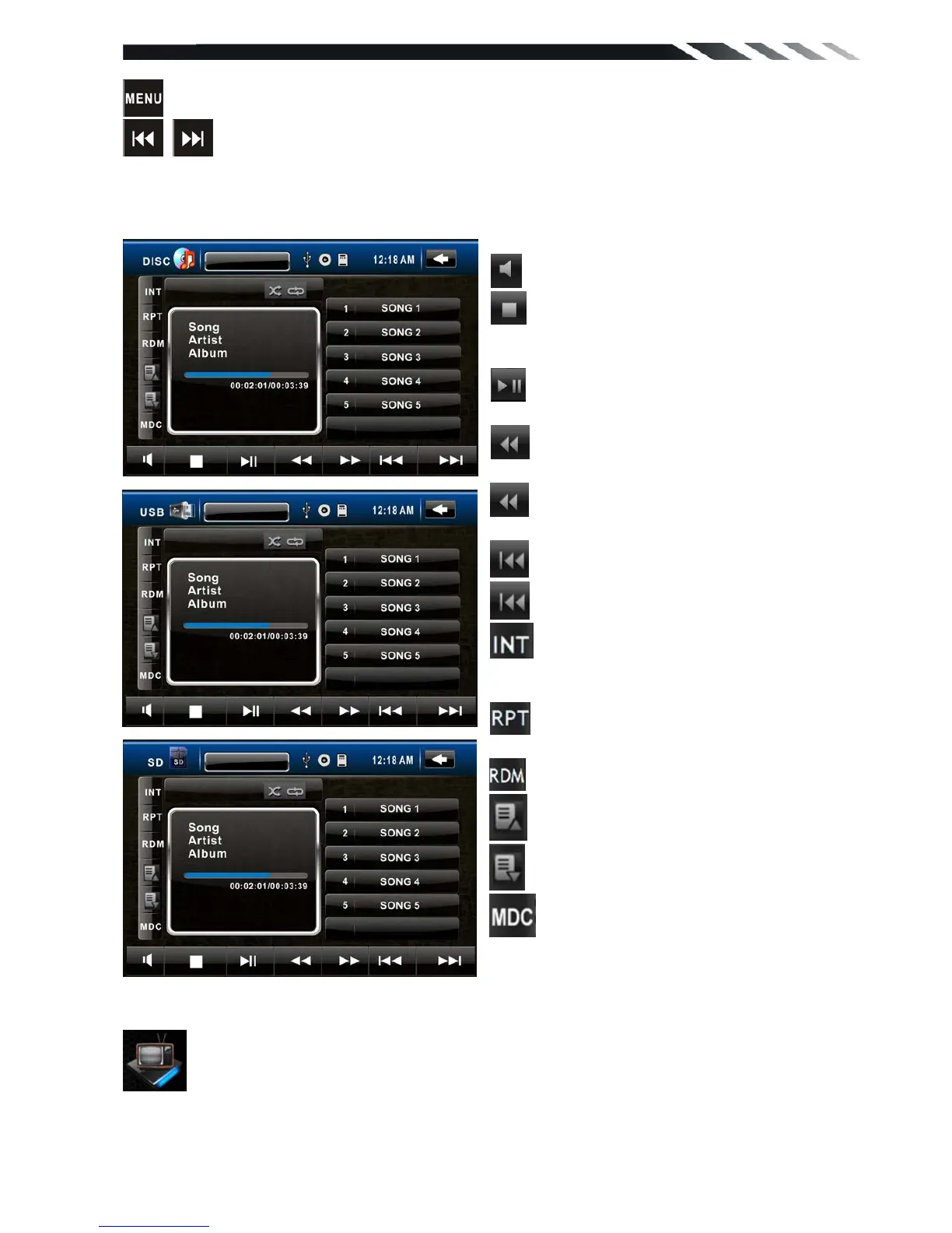 In DVD mode touch it to enter TITLE MENU (Enable only if the DVD disc with title menu).