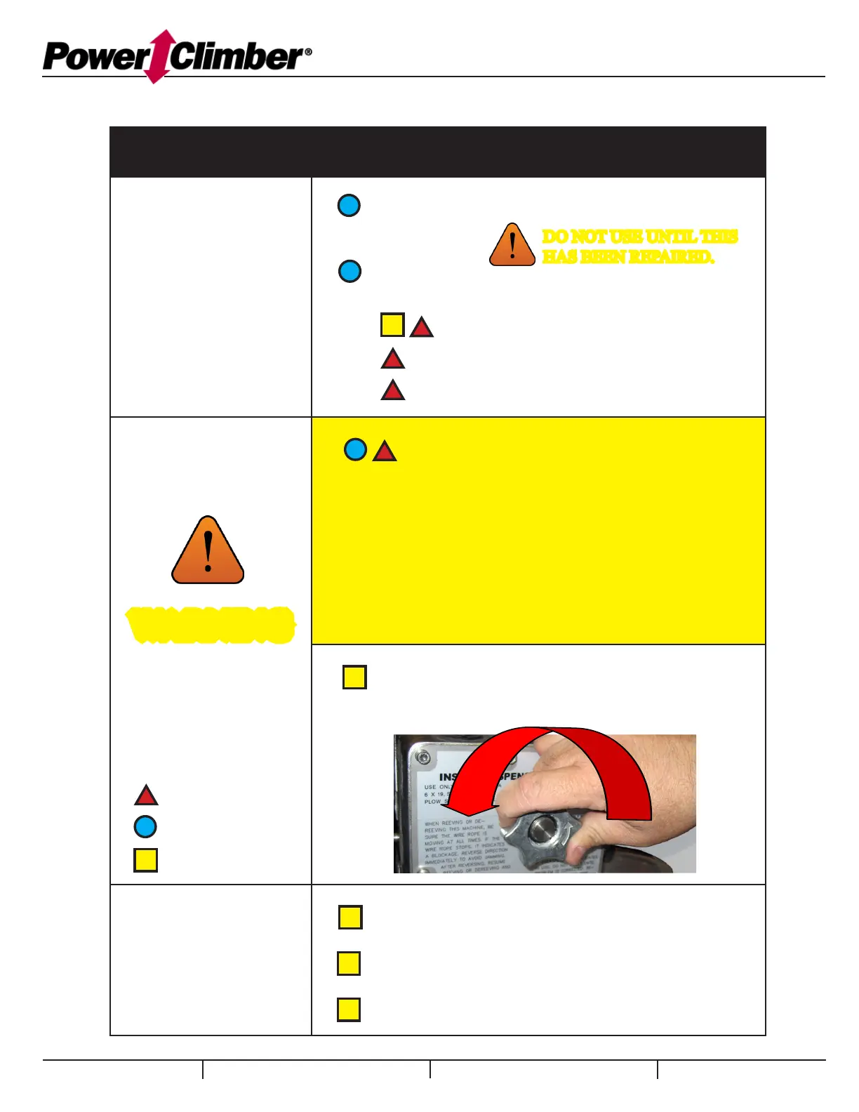 Return the hoist to be serviced by a Power Climber dealer.