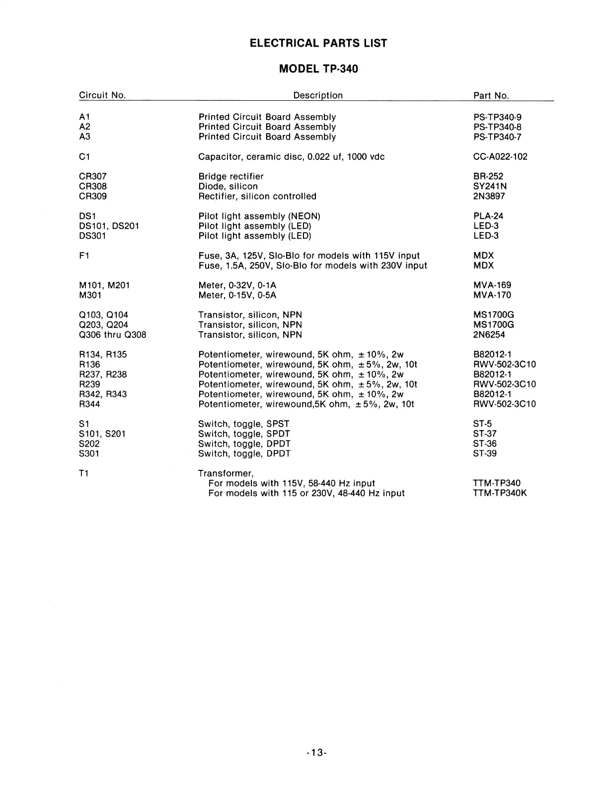 ELECTRICAL PARTS LIST