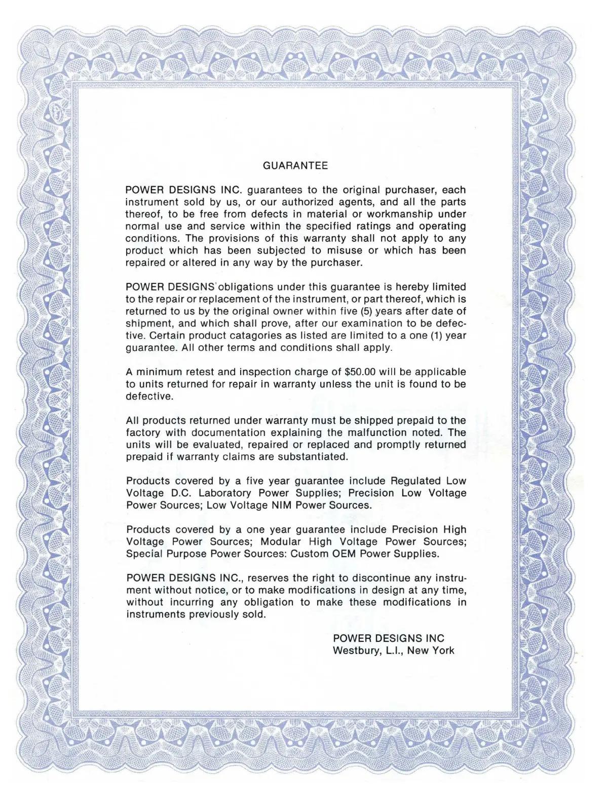POWER DESIGNS INC. guarantees