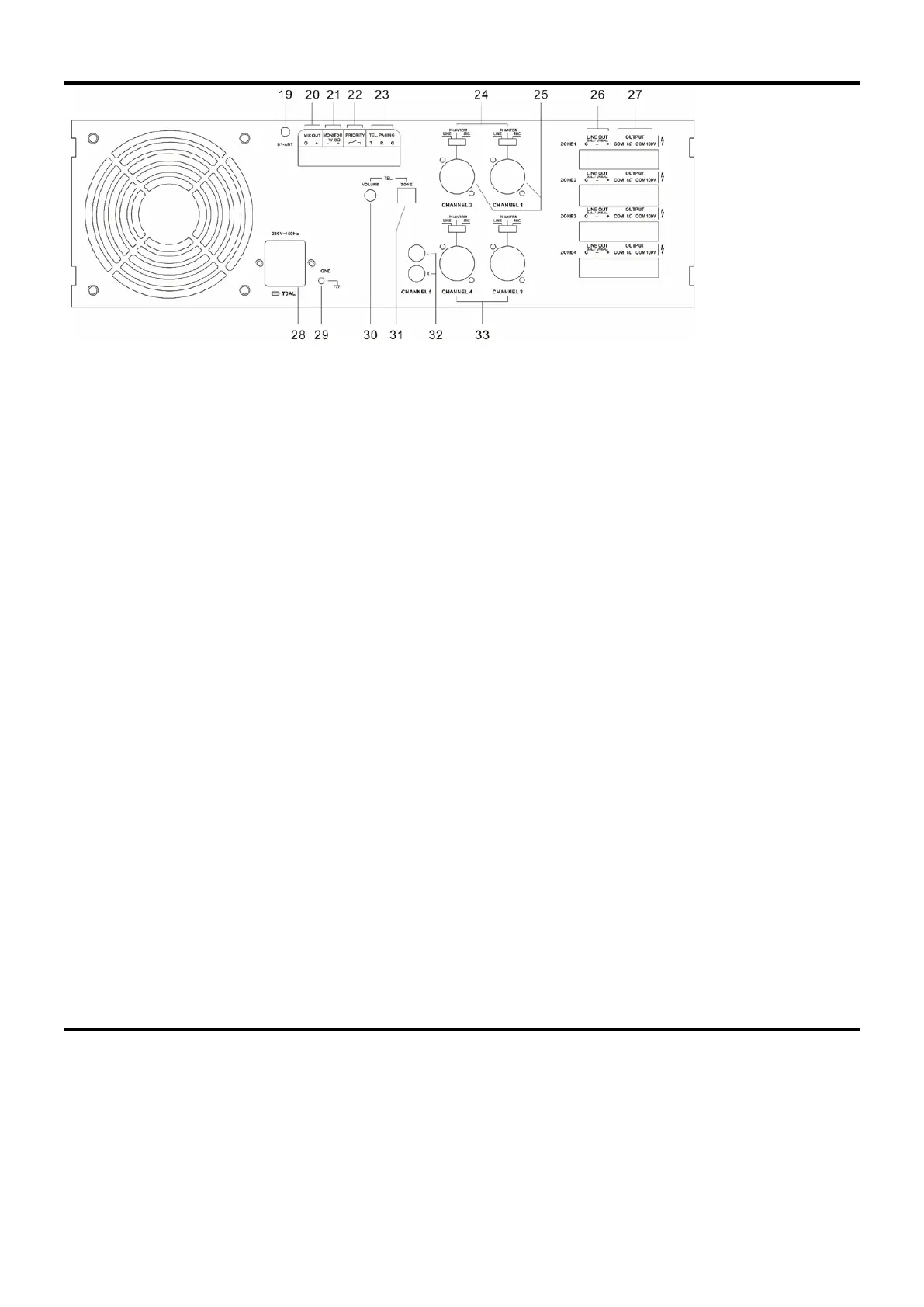 Sortie du signal de ligne pour la connexion d'un autre amplificateur ou d'un enregistreur. Les signaux de la zone PA sont