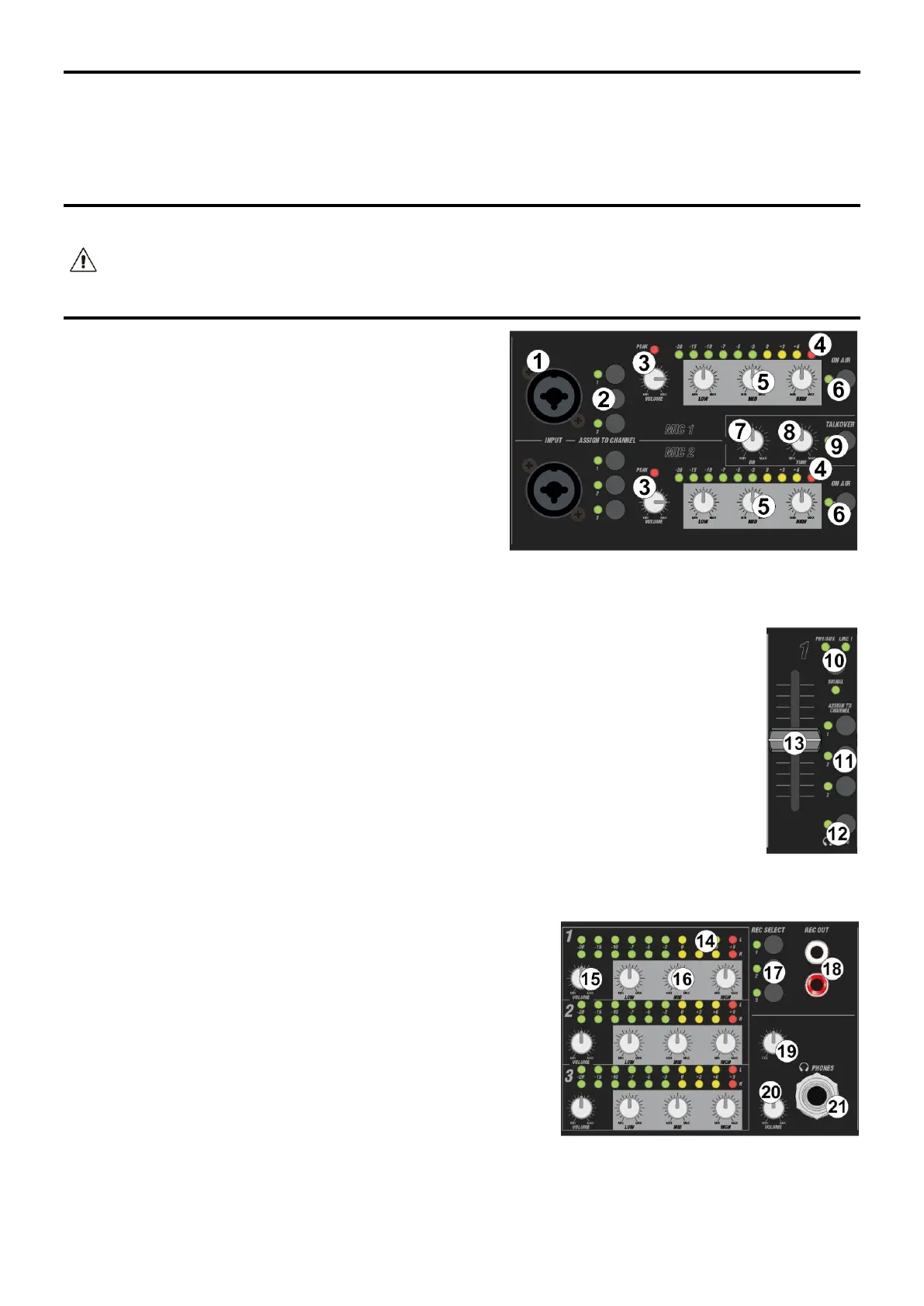 Trójdrożny korektor dla kanałów mikrofonowych (HI, MID, LOW).