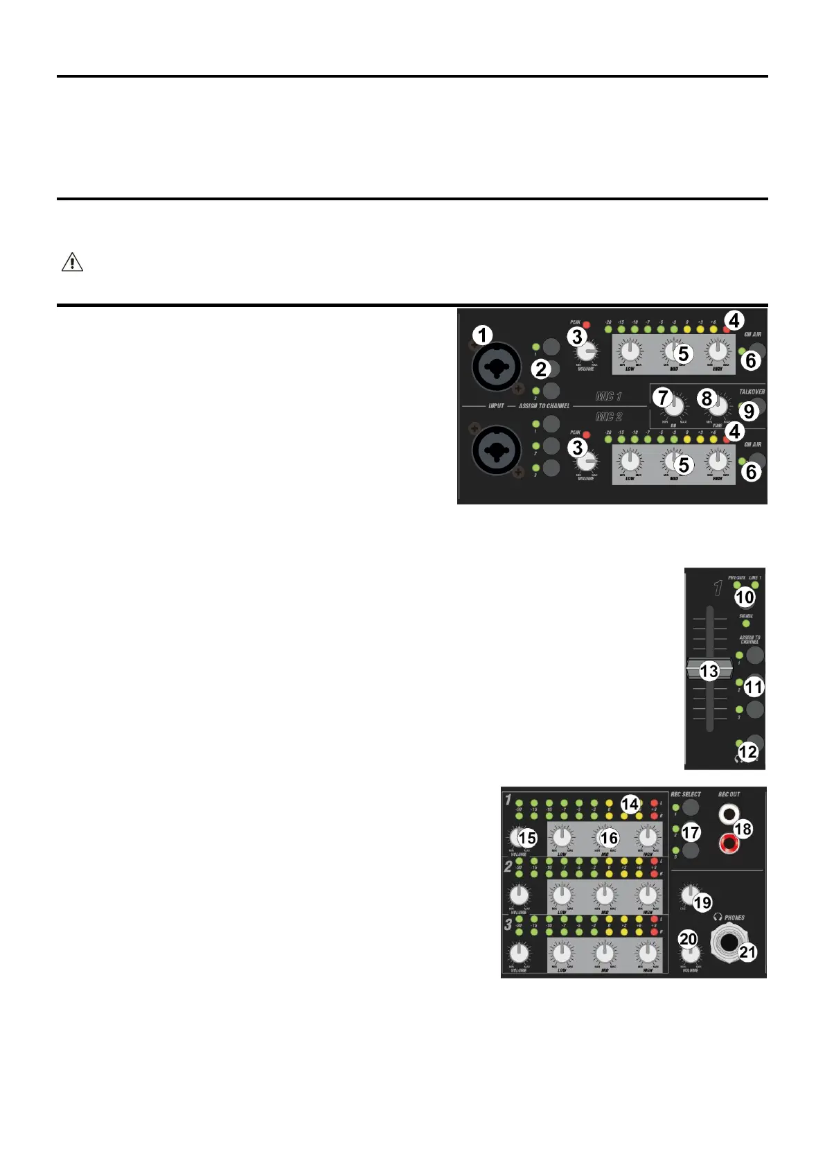 Třípásmový ekvalizér pro mikrofonní kanály (HI, MID, LOW).