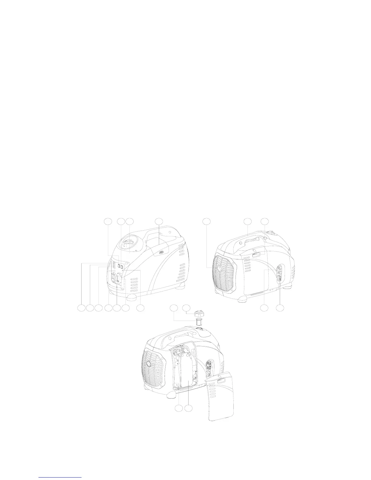 (13) AC receptacle (14) Ground (earth) terminal (15) Fuel filter