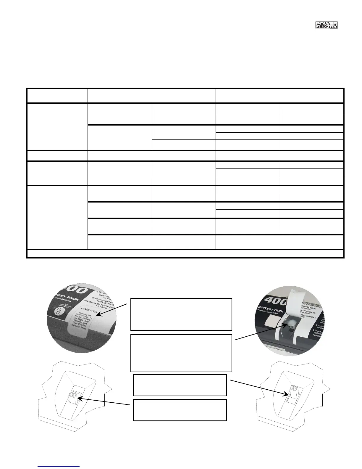 lamp selector table. Battery Packs are shipped from the factory in the “DOWN” position.