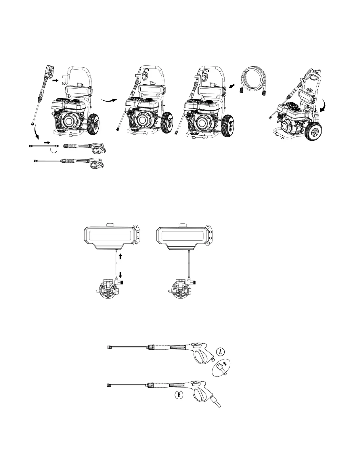 coloque el conjunto de la pistola en el gancho. Colgar el tubo de alta presión en el tubo intermedio con